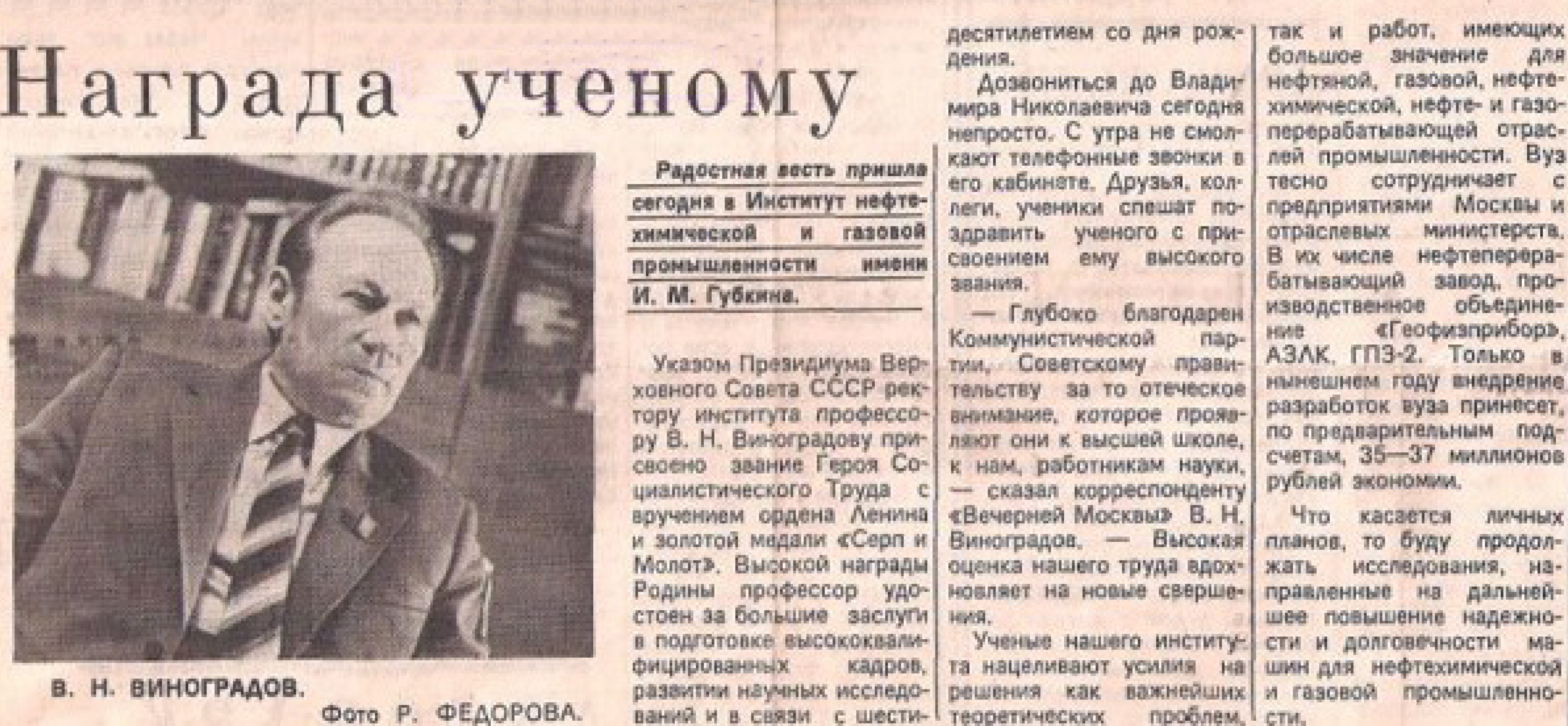 По инициативе В.Н. Виноградова создана новая форма творческого содружества академической и вузовской науки. Под его руководством институт занял передовые позиции в развитии нефтегазовой науки, успешно сочетая фундаментальные и прикладные исследования. В университете проводились отраслевые научно-технические конференции и совещания с участием ученых из НИИ и специалистов нефтяной, газовой и химической промышленности.