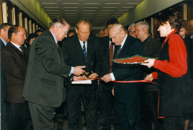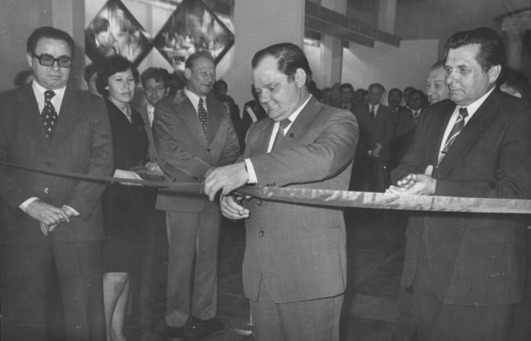 На открытии павильона № 45 «Нефть» на ВДНХ. Перерезает ленту министр нефтяной промышленности СССР Н.А. Мальцев Октябрь, 1978