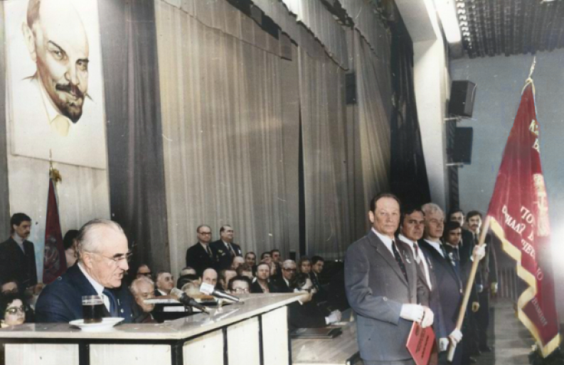 Министр образования СССР В.П. Елютин вручает переходящее Красное Знамя коллективу МИНХ и ГП имени И.М. Губкина, 1981